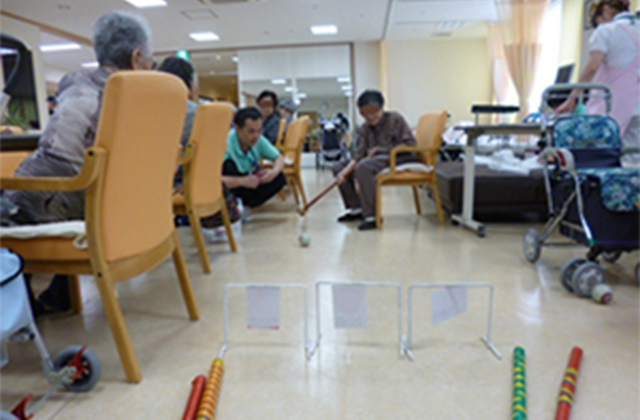 午前中はリハビリ室で、午後は食堂で過ごしていただき、座って過ごす時間を設けています。その中で、スタッフや他の患者様と一緒にレクリエーションを楽しむことができます。